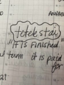Before driving off, I checked my messages. The friend who prayed for me had sent his church notes—“Tetelestai” printed boldly in the middle.